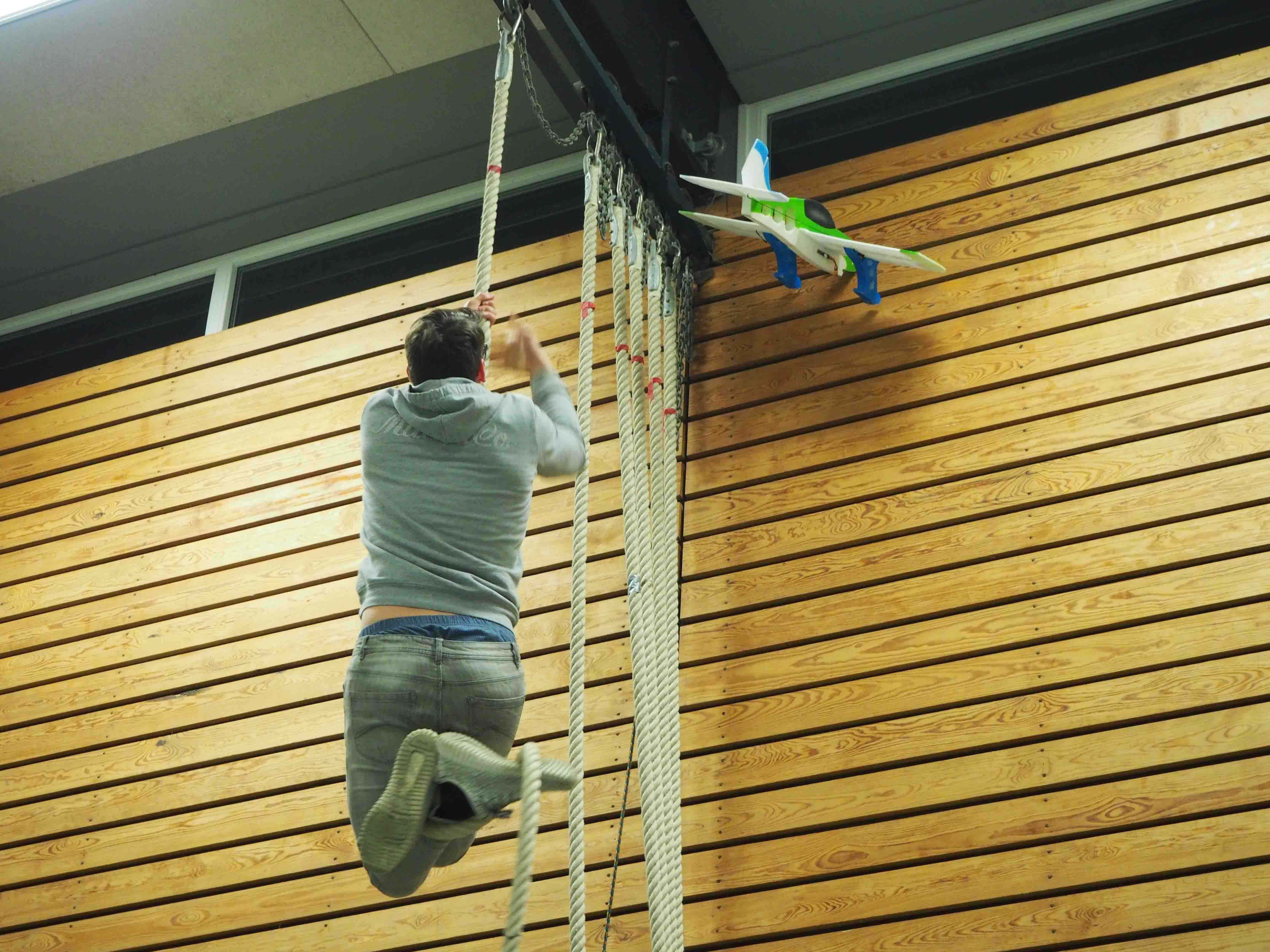 Wenn mal ein Modell auf Abwegen ist und einfach in der Turnhallenwand steckenbleibt wird der Sportsgeist geweckt und die müden Glieder werden das Seil raufgescheucht.